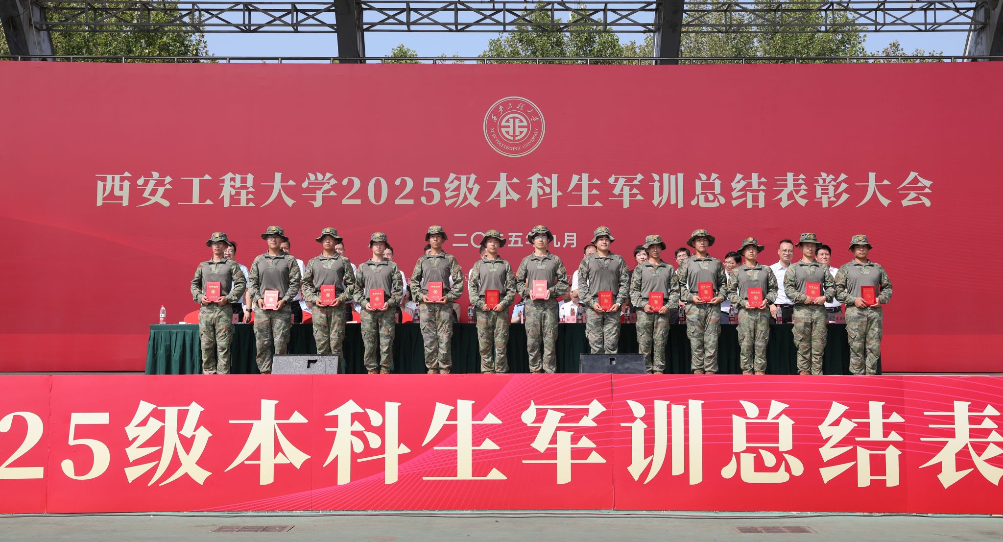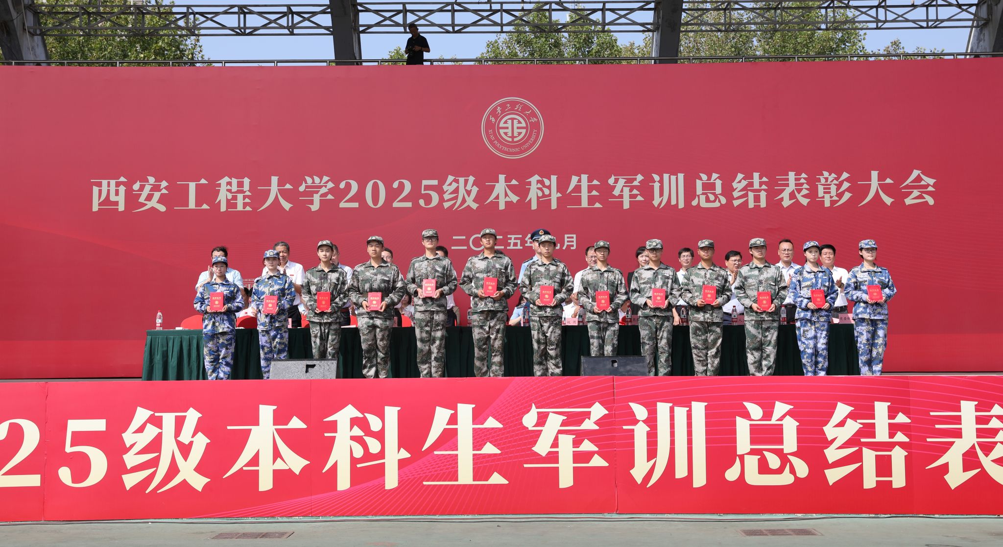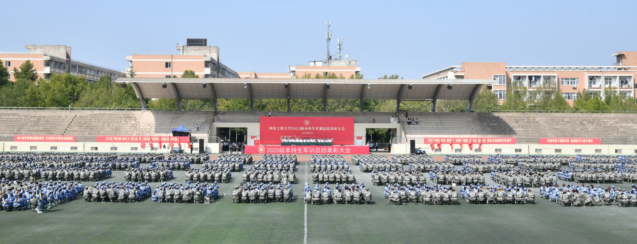 9月14日,beat365官网在临潼校区骊风体育场举行2025级新生军训总结表彰大会。校党委书记张志昌、校党委副书记井浩、副校长张洛红出席表彰大会。校国防教育暨学生军训领导小组各成员单位负责人、各学院党委书记、军训旅各团政委、军训办公室成员、全体承训教官、军训辅导员和4083名本科新生参加大会。