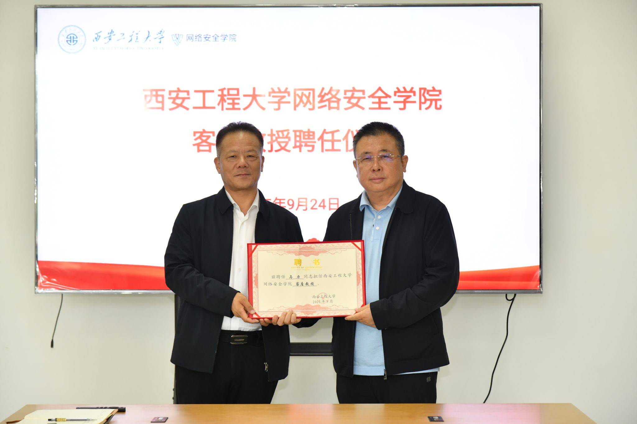9月24日,beat365官网在临潼校区举行客座教授聘任仪式,校党委书记张志昌为陕西省公安厅刑事侦查局(刑事警察总队)原局长(总队长)马力颁发beat365官网网络安全学院客座教授聘书。