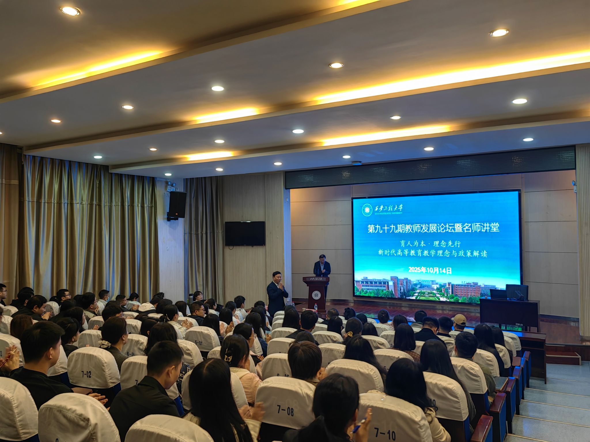 报告中,赖绍聪以“育人为本·理念先行 新时代高等教育教学理念与政策解读”为题,从多个关键维度展开深度阐述。他首先围绕高等教育发展现状、《教育强国建设规划纲要(2024—2035年)》核心要求、国家“四新”战略指导思想、OBE教育理念及以学为中心、建构主义与教育教学目标方面,系统梳理了新时代高等教育的发展趋势,为新入职教师搭建起清晰的教育理念框架。随后,赖教授进一步聚焦教学实践,从教学目标厘定、知识体系构建、教师教学策略、学生学习策略、教学氛围营造、学生学业评价六大维度,对新时代高等教育教学范式进行了全面且细致的解读。他特别强调,当前教育功能需实现三大关键转变:从以知识继承为主转向以创新能力培养为主,从以知识传授为主转向以创造力激发为主,从以训练标准化个性为主转向以培育多样化个性为主,为新教师的教学实践提供了明确指引。最后,赖教授结合自身丰富的教育经验,围绕“教师角色与职责”分享深刻见解。他指出,高校教师须具备持久的教育激情、执着的育人情怀与高度的专业素养,努力成为学生成长道路上“可以仰望的身影”。整场报告内容充实、见解独到,为新入职教师上了一堂生动且实用的“入职第一课”。